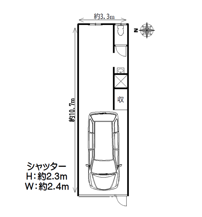 シャッター開口高さ2.3m幅2.4m、収納、専用トイレ、手洗い場など嬉しい設備!
